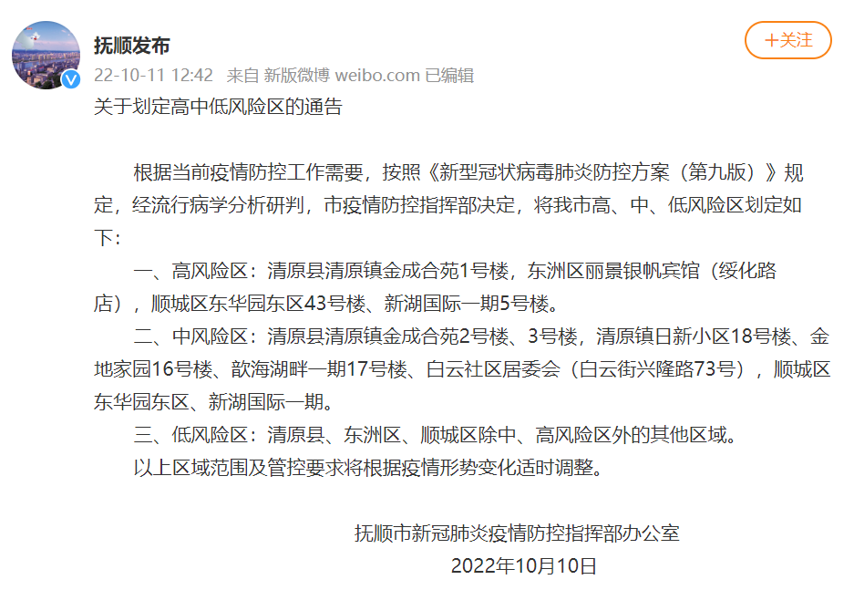 三、低风险区:清原县、东洲区、顺城区除中、高风险区外的其他区域。
