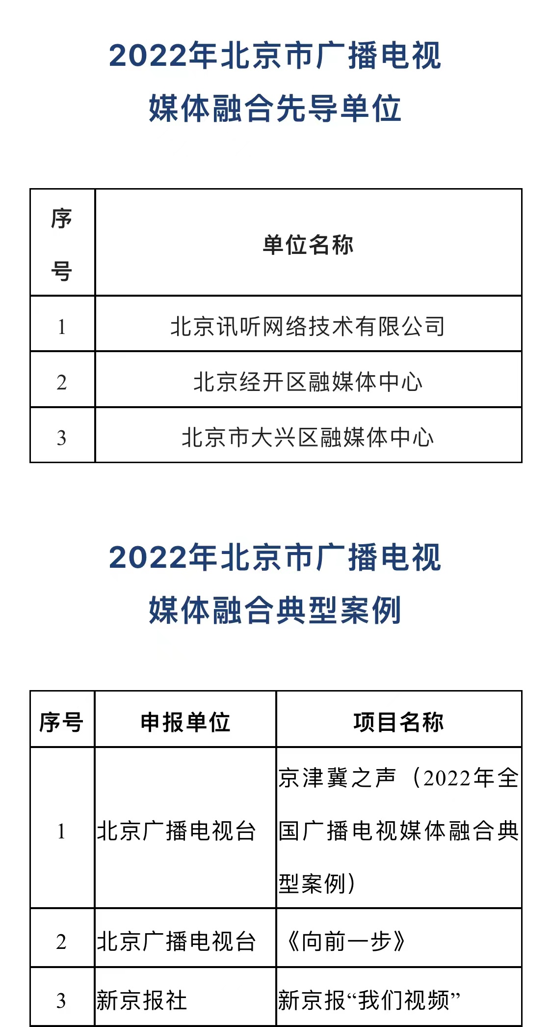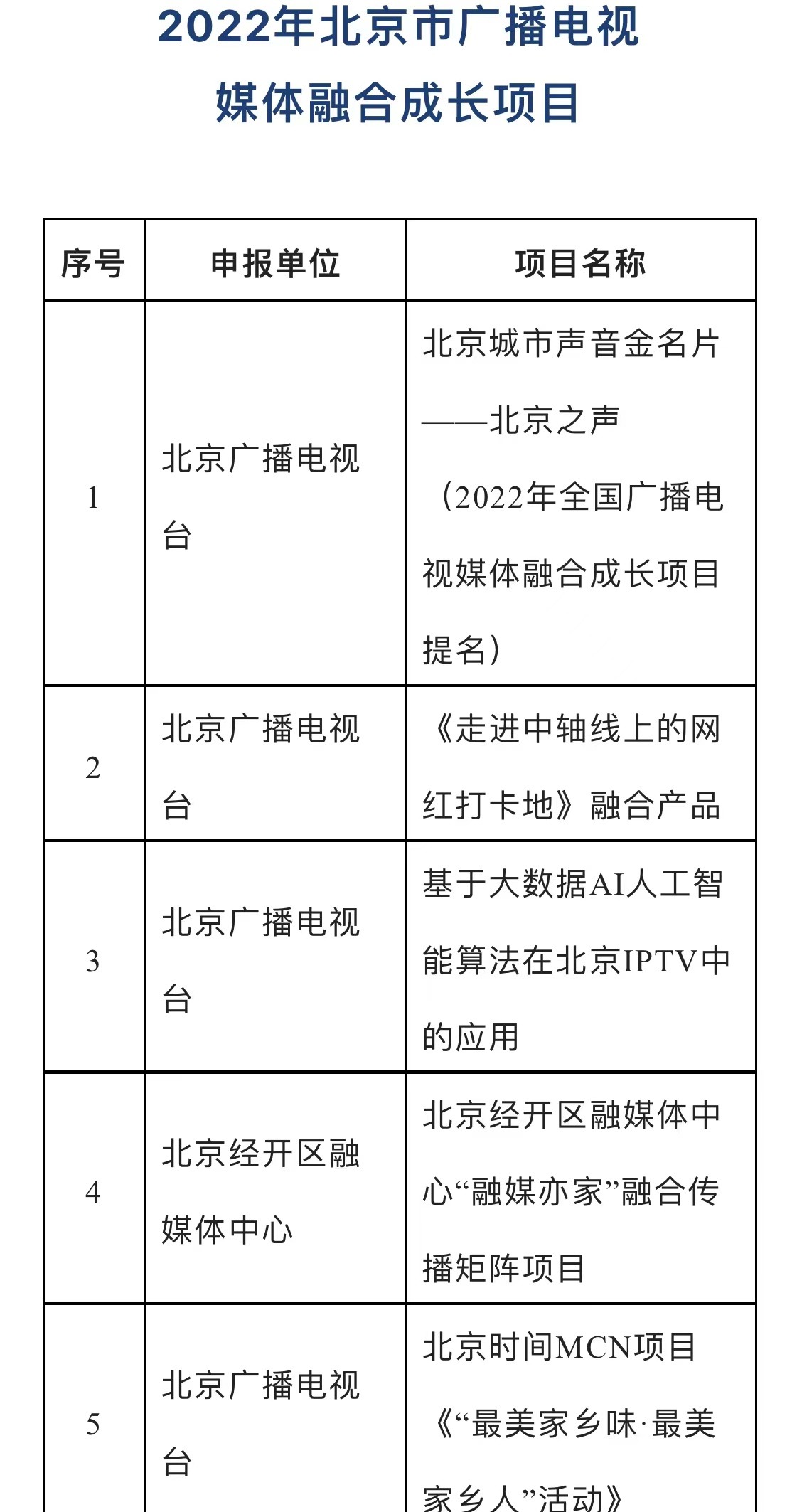 为深入贯彻落实中央《关于加快推进媒体深度融合发展的意见》精神,加快推进北京广播电视媒体融合向纵深发展,进一步发挥先进典型的示范作用和重点项目的带动作用,2022年,北京市广播电视局继续开展北京市广播电视媒体融合先导单位、典型案例、成长项目征集评选活动。