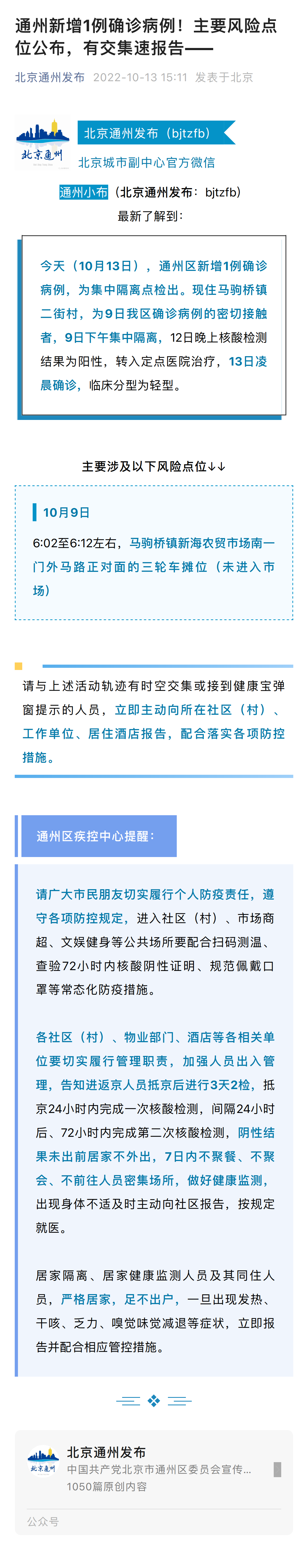 今天(10月13日),通州区新增1例确诊病例,为集中隔离点检出。现住马驹桥镇二街村,为9日我区确诊病例的密切接触者,9日下午集中隔离,12日晚上核酸检测结果为阳性,转入定点医院治疗,13日凌晨确诊,临床分型为轻型。