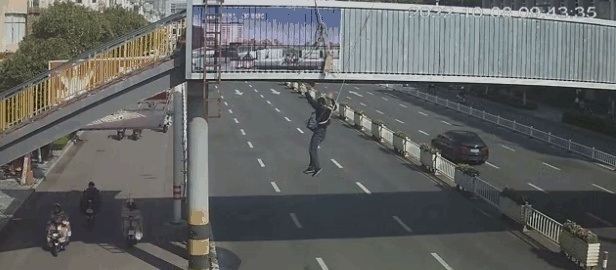 该男子仅靠着绳子与天桥相连