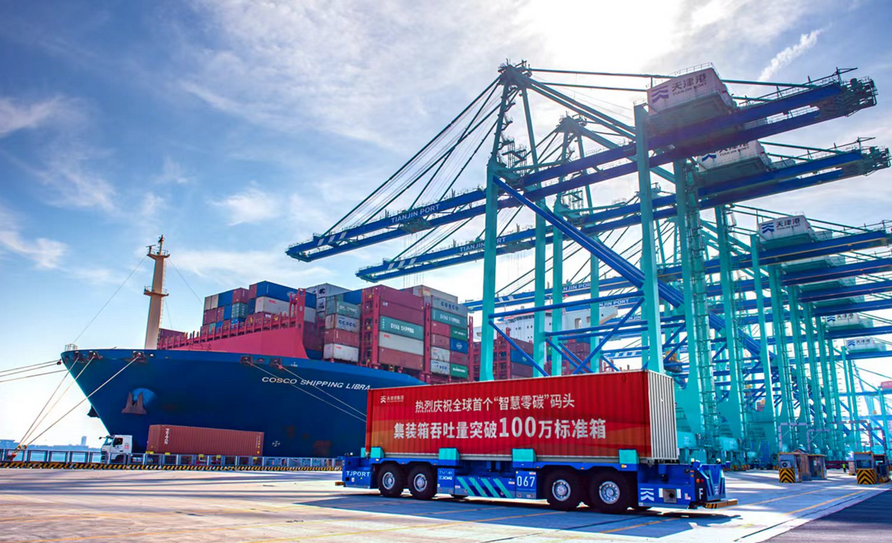 10月13日上午,随着自动化岸桥将投产运营以来的第100万个标准箱,从智能水平运输机器人上稳稳吊起,装上近400米长的“中远海运天秤座”轮,天津港全球首个“智慧零碳”码头创下从开工建设到完成100万标准箱作业用时33个月的全球自动化集装箱码头用时最短纪录。