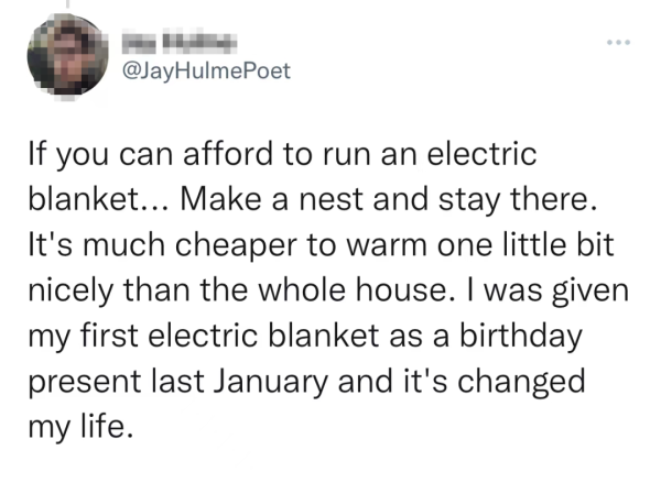 “如果你能买得起一个电热毯,做个窝,搞舒服一点,就待在那里吧。用电热毯取暖比把整个房子都弄热要便宜得多。去年1月我生日的时候,我收到了我的第一个电热毯,从此它改变了我的生活。”