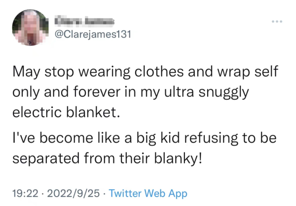 “我可以不再穿衣服,把自己永远包裹在超级舒适的电热毯里!我已经变成了一个大孩子,拒绝离开自己的毯毯!”