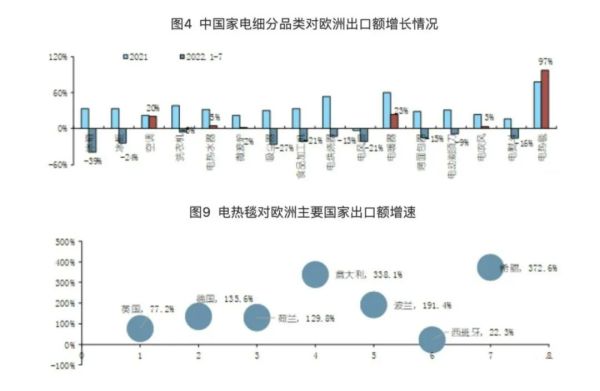 中国家用电器协会数据显示,2022年以来,家电产品对欧洲出口增长的品类主要包括空调、电热水器、电暖器、电热毯、电吹风、取暖器等,其中电热毯以97%的增速引领其他品类。