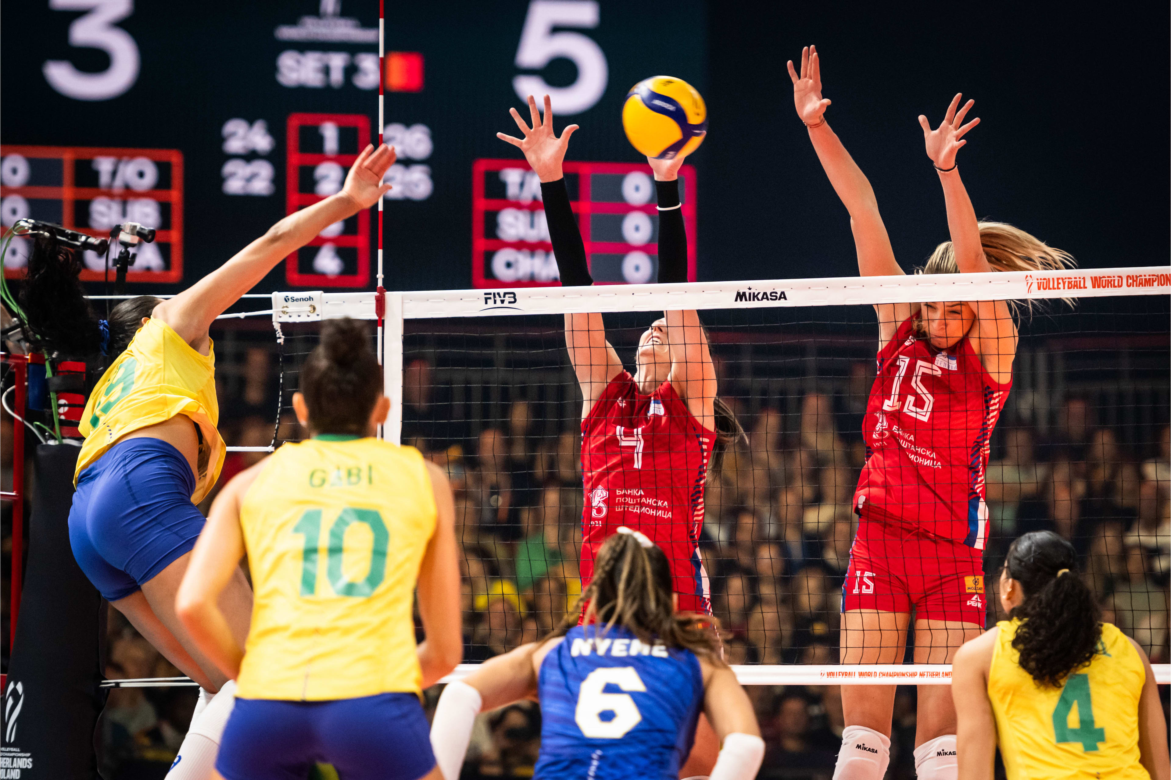 巴西队由罗贝塔出任主二传,泰纳拉和加比组成主攻线,试图改变节奏,但塞尔维亚队发挥稳定,博斯科维奇打吊结合,塞尔维亚队以16比8大比分领先。
