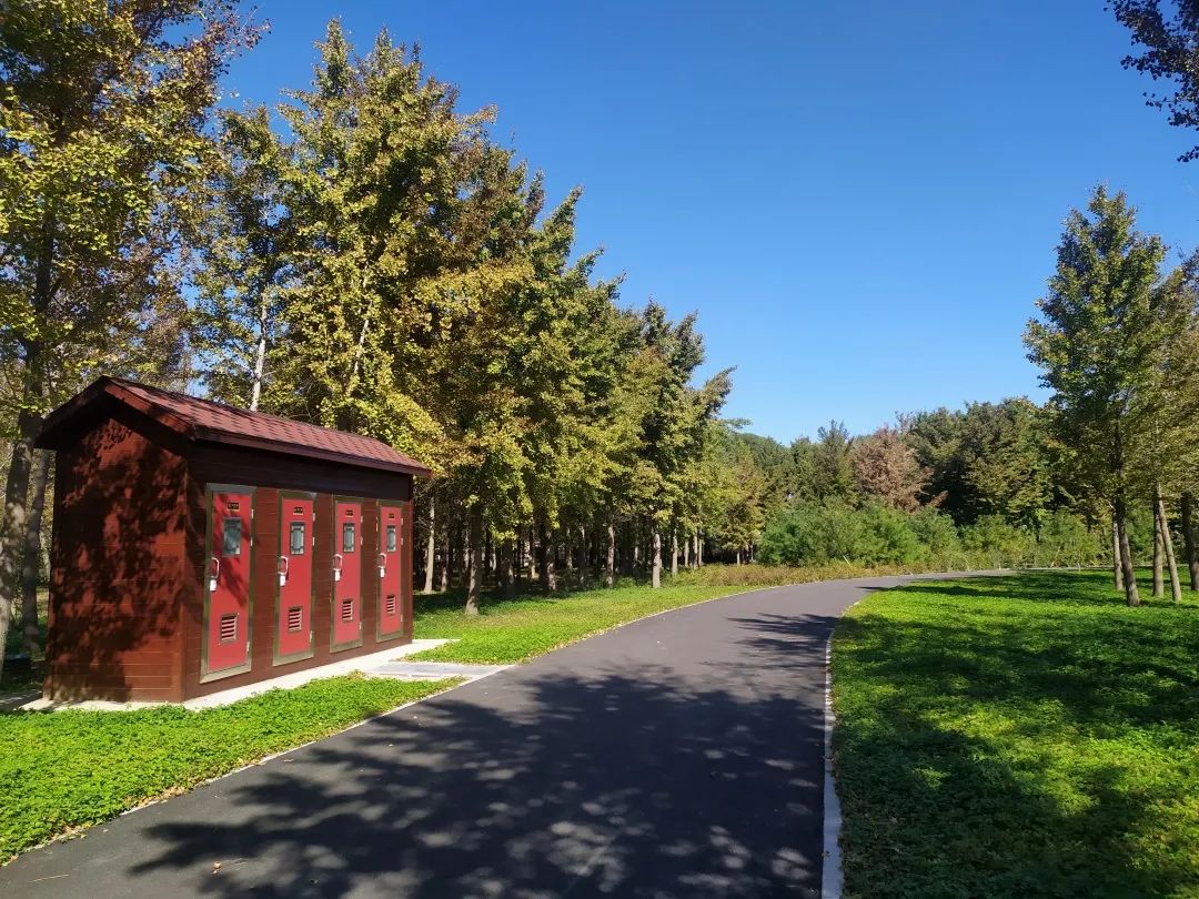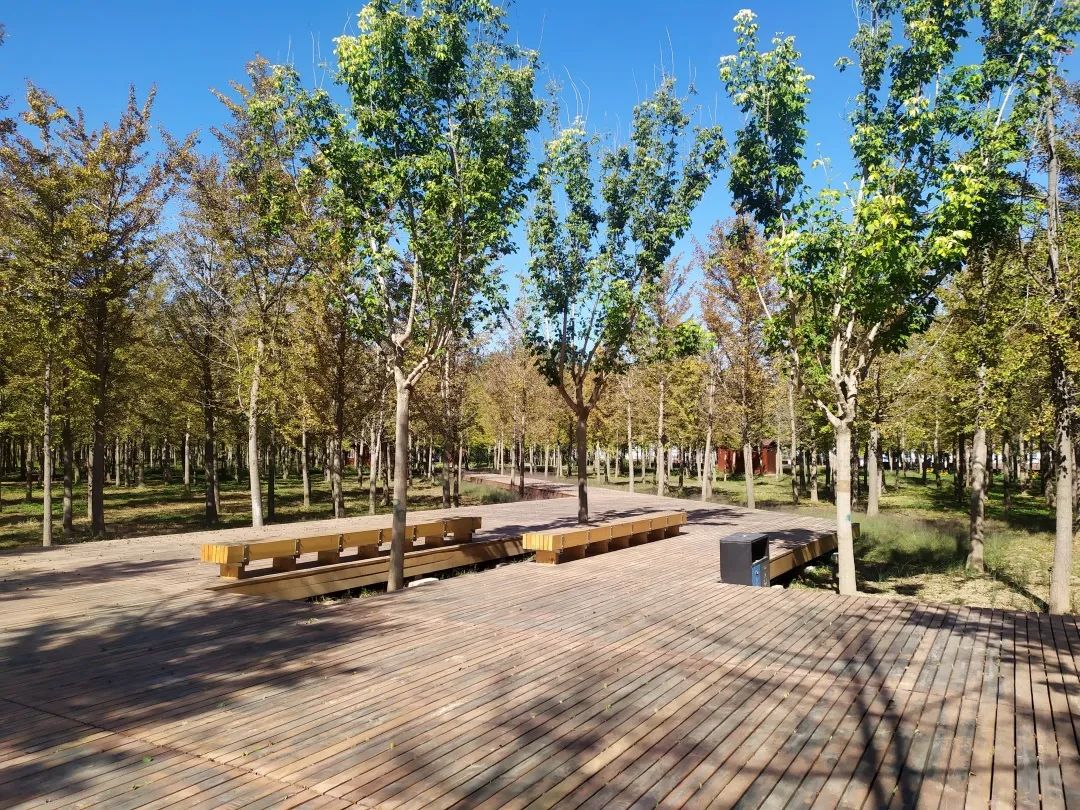 秋高气爽,伴着微风,漫步公园内,抬头仰望是湛蓝的天空,低头凝眸是翠绿的地被植物,身旁所依则是连片黄绿交织的银杏树。记者在公园北门处看到,进入盛花期的天人菊色彩鲜艳;沿着木栈道从东向西而行,栈道两侧的粉黛乱子草随风摇曳,给金黄色的秋天增添了一抹少女般的浪漫;随风飘落的银杏叶落在步道上,脚踩上去发出悦耳的声音;沿主路而行,道路两侧设有休闲座椅、公共卫生间、垃圾分类站等服务设施。