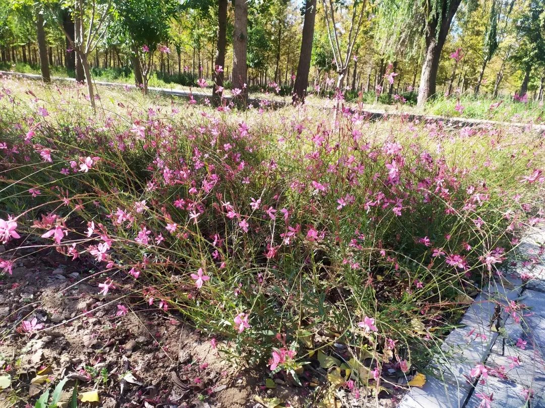 步道转角处的粉色山桃草随风起舞。