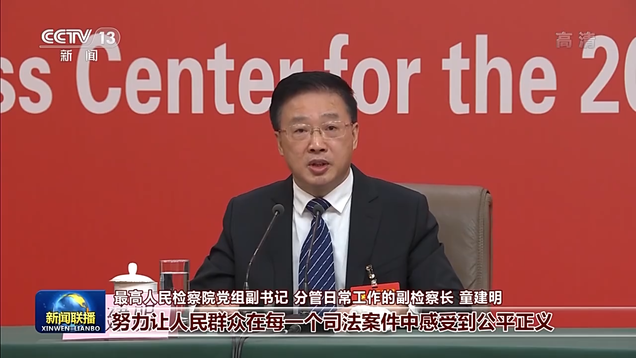 最高人民检察院党组副书记、分管日常工作的副检察长 童建明:通过加强对侦查、审判和刑罚执行活动的法律监督,努力让人民群众在每一个司法案件中感受到公平正义。