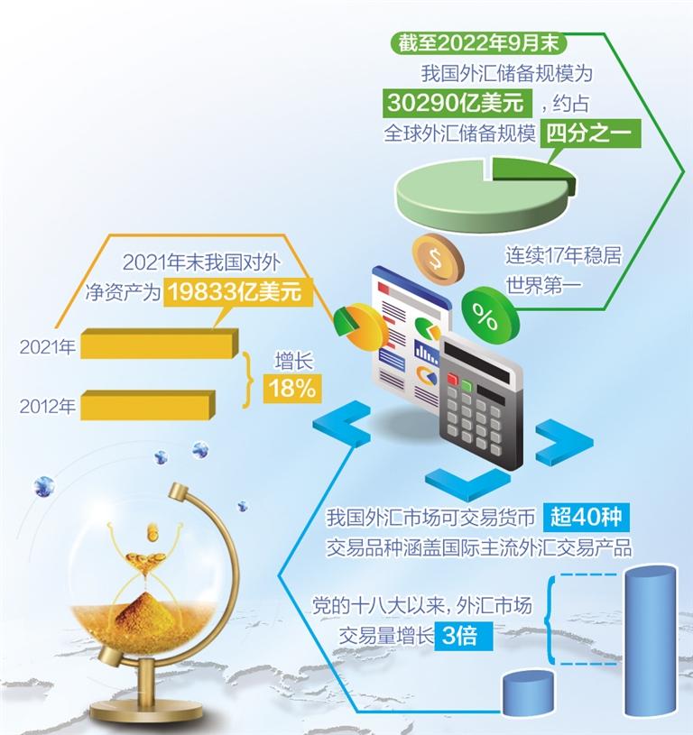 党的二十大报告指出,我国经济实力实现历史性跃升。其中,“外汇储备规模稳居世界第一”是重要标志之一。数据显示,截至2022年9月末,我国外汇储备规模为30290亿美元,约占全球外汇储备规模的1/4。