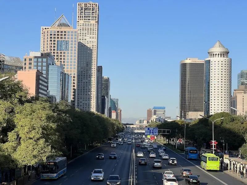 采访时,空气中的细颗粒物也就是PM2.5的浓度每立方米只有7微克,天空通透湛蓝。站在建国路的一处过街天桥上,数十公里外的群山清晰可见。