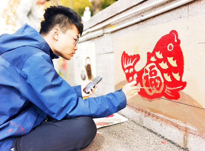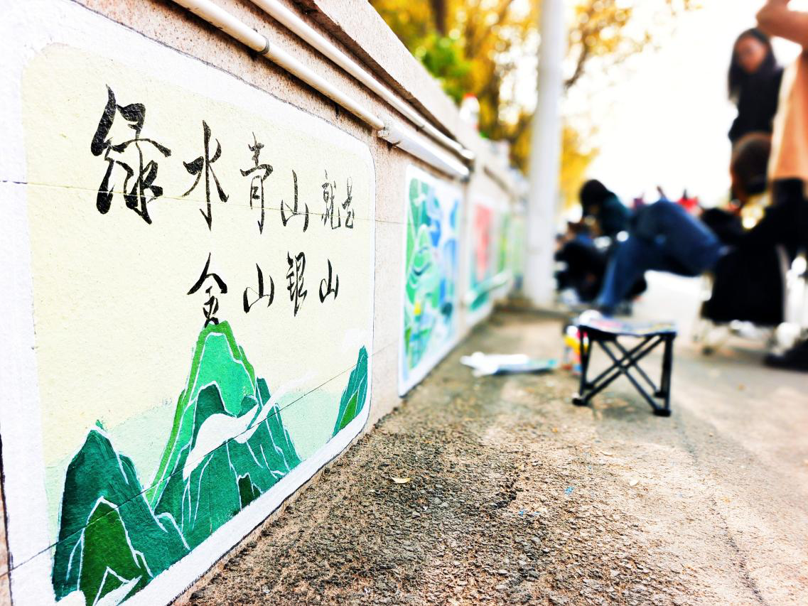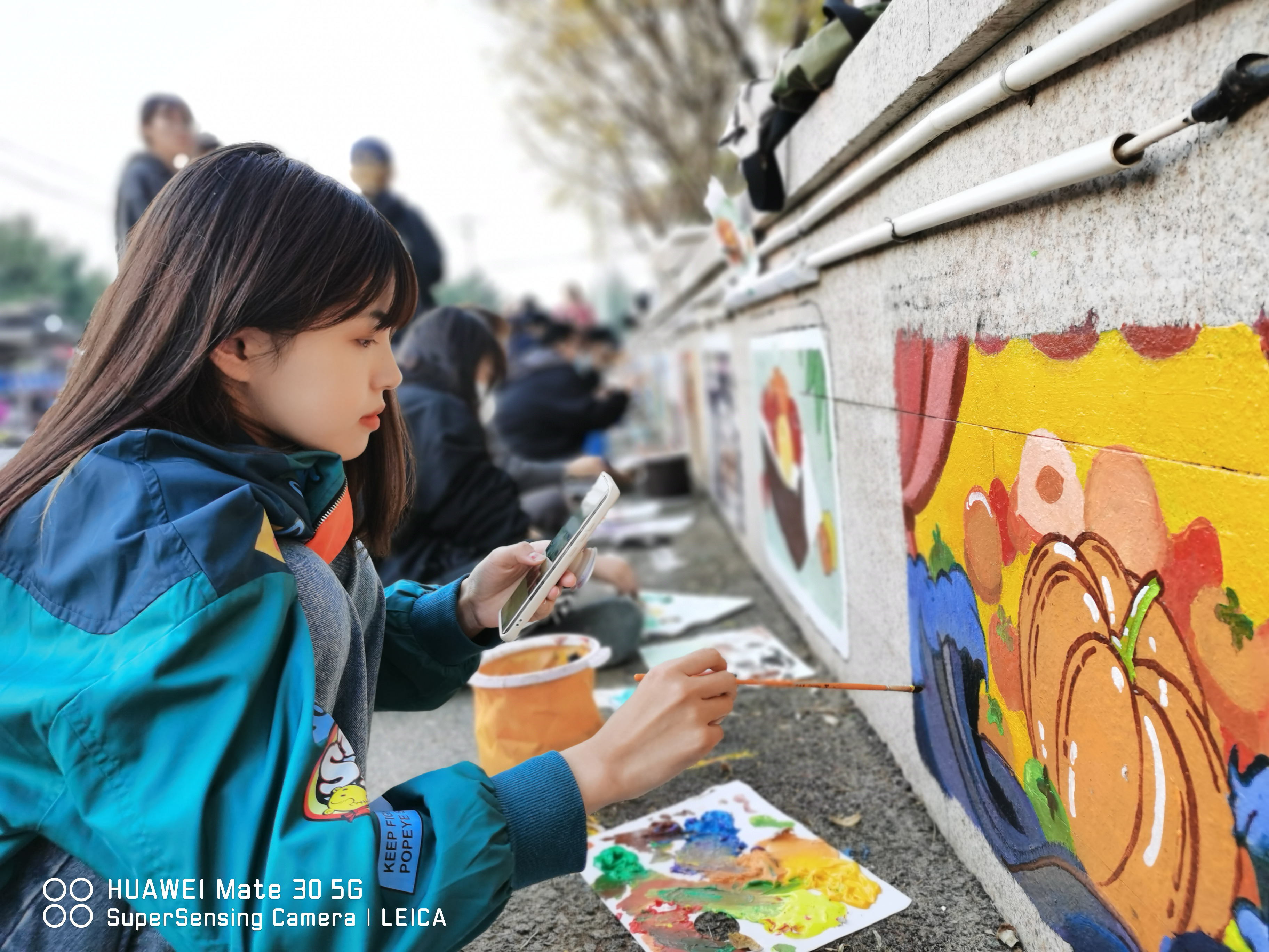 仙人洞村西侧90余米的外墙是此次绘制的主区域,从绘制区域定位到草稿、线稿,再到上色成图,师生们认真对待每一个环节,用尺子测量间距、比对创作手稿、绘制基础草图、调配颜料上色……大家忙得热火朝天、干劲十足。