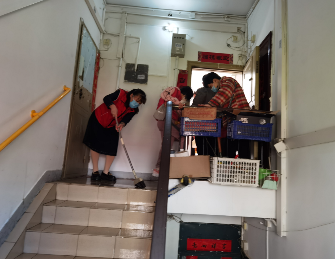 为了减少漏水带来的损失,社区工作人员和自发出门的居民拿着笤帚、盆子、木板,齐心协力把积水一点点推到楼道外的排水井里。“从接到居民求助,到清理干净楼道里的积水,只用了一个多小时。”杨燕清说。