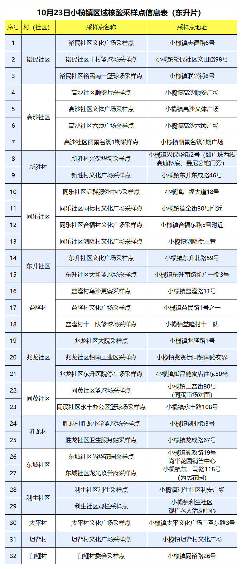 四、10月23日11:30-17:30开展小榄镇东升片区域核酸检测,东升片设32个固定核酸采样点(详见附表)。请广大群众积极配合做好核酸检测,遵守采样点的现场秩序,保持一米距离,做好个人防护,有序到指定地点开展核酸检测。核酸检测前如有接种新冠疫苗的,必须相隔48小时后再进行检测。