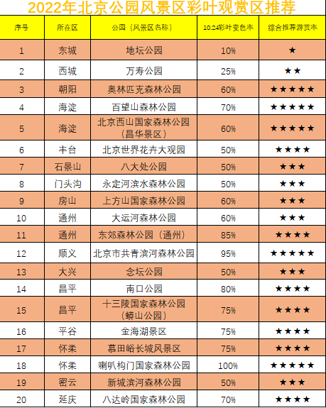 据首都园林绿化 10月24日消息,目前北京已进入秋季彩叶观赏高峰期,20处公园风景区彩叶变色率最新情况如下——