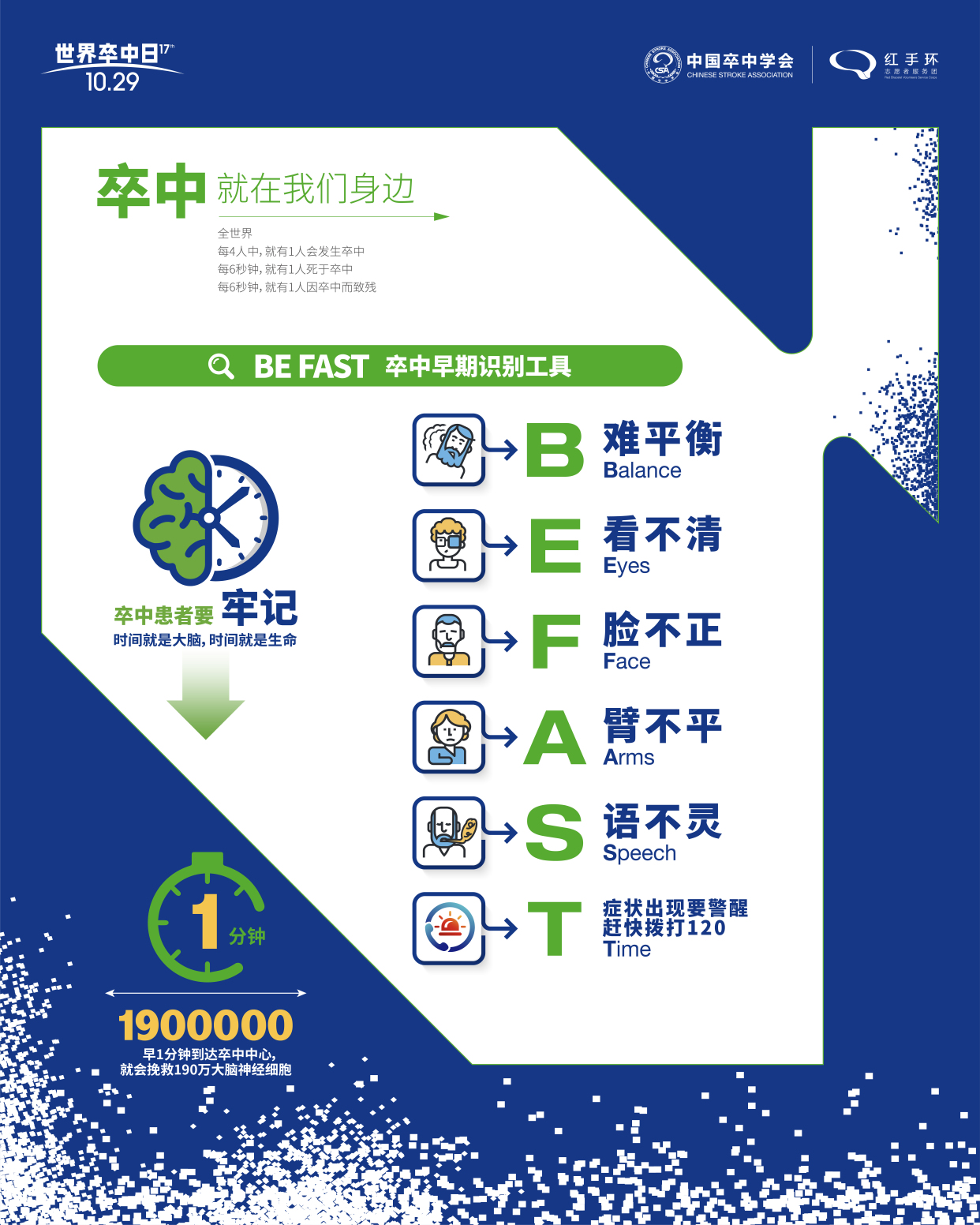 2021年7月,中国卒中学会在第七次学术年会期间正式发布了识别卒中早期症状的“BE FAST口诀”,前5个字母各代表一个早期症状,最后1个字母是提醒一旦发现卒中症状,就要马上拨打急救电话,立刻就医: