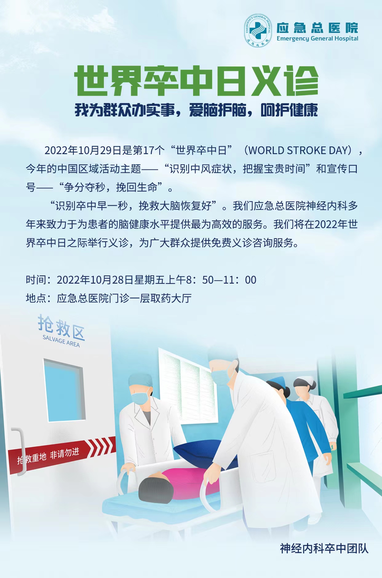 为积极响应号召,做好卒中防治宣传,应急总医院神经内科于2022年10月28日上午9:00-11:00在本院区门诊楼一层药房大厅举办义诊咨询活动。