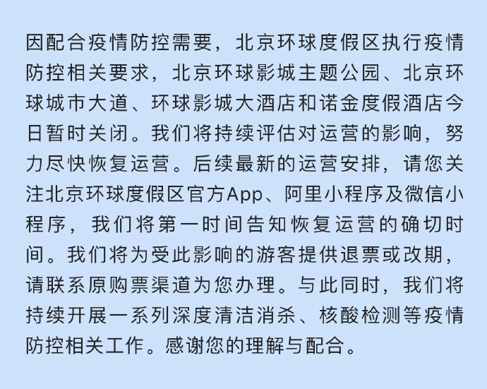 因配合疫情防控需要,北京环球度假区执行疫情防控相关要求,北京环球影城主题公园、北京环球城市大道、环球影城大酒店和诺金度假酒店今日暂时关闭。我们将持续评估对运营的影响,努力尽快恢复运营。后续最新的运营安排,请您关注北京环球度假区官方App、阿里小程序及微信小程序,我们将第一时间告知恢复运营的确切时间。我们将为受此影响的游客提供退票或改期,请联系原购票渠道为您办理。与此同时,我们将持续开展一系列深度清洁消杀、核酸检测等疫情防控相关工作。感谢您的理解与配合。
