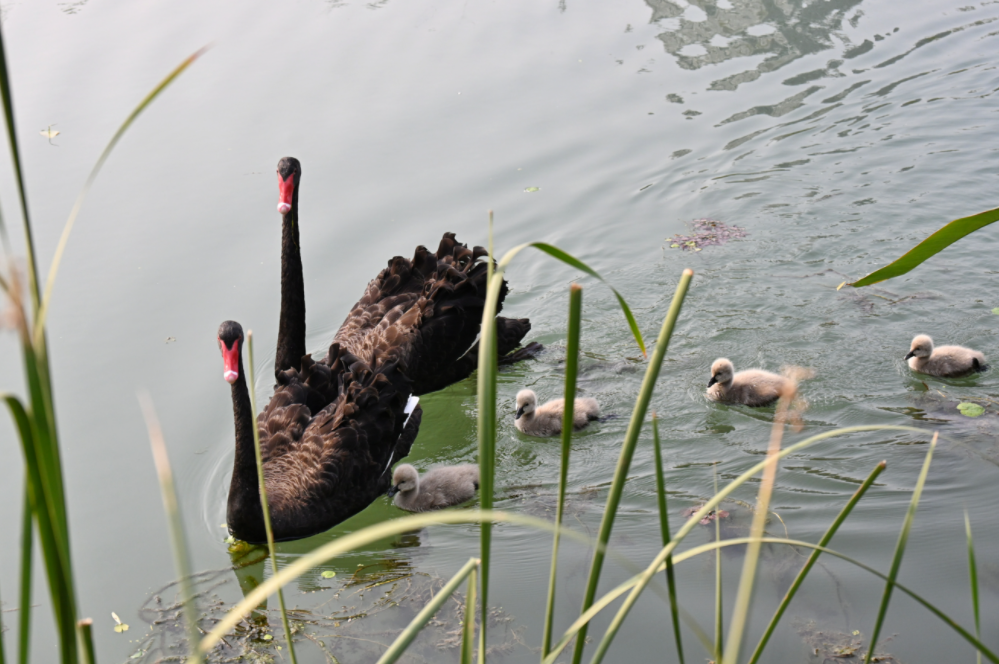 在朝阳公园的野鸭岛,黑天鹅夫妇最近迎来了五只宝宝。一家七口在湖中悠然游弋,吸引了不少市民游客围观。