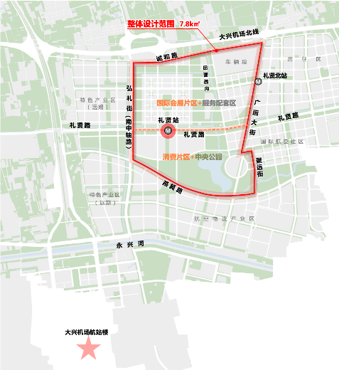 应征方案应注重大兴机场临空区各片区的协同关系及区域系统性问题,突出会展消费枢纽等形象标识性;设计内容包括但不限于功能定位与空间布局、建筑强度及高度、蓝绿空间体系与布局、生态低碳场景、风貌管控、公共空间、市政设施、交通组织与路网、地下空间、分期建设与实施计划等方面;重点对会展功能区、消费功能区及礼贤站节点进行设计研究,综合考虑建筑方案的实施与延续性,从而彰显临空新门户形象。