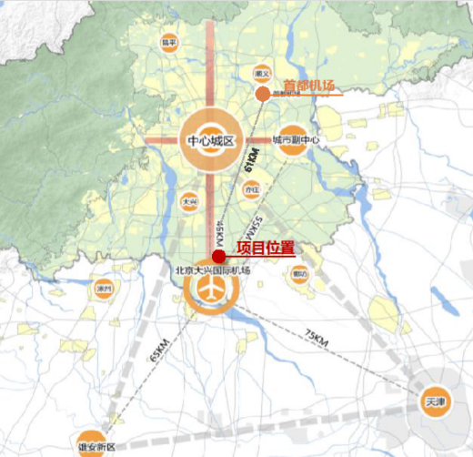 北京大兴国际机场临空经济区(大兴)管理委员会相关负责人介绍,临空经济区会展消费片区项目位于北京大兴国际机场临空经济区礼贤片区,北京中轴线南段,距离大兴机场航站楼约5公里。会展消费片区东临广运大街和聚远街,南临燕冀路,西临弘礼街(南中轴路),北临诚和路,占地面积约7.8平方公里。项目周边东侧为居住区和国际航空社区,南部以航空物流产业为主,西侧为特色产业区(预留)。