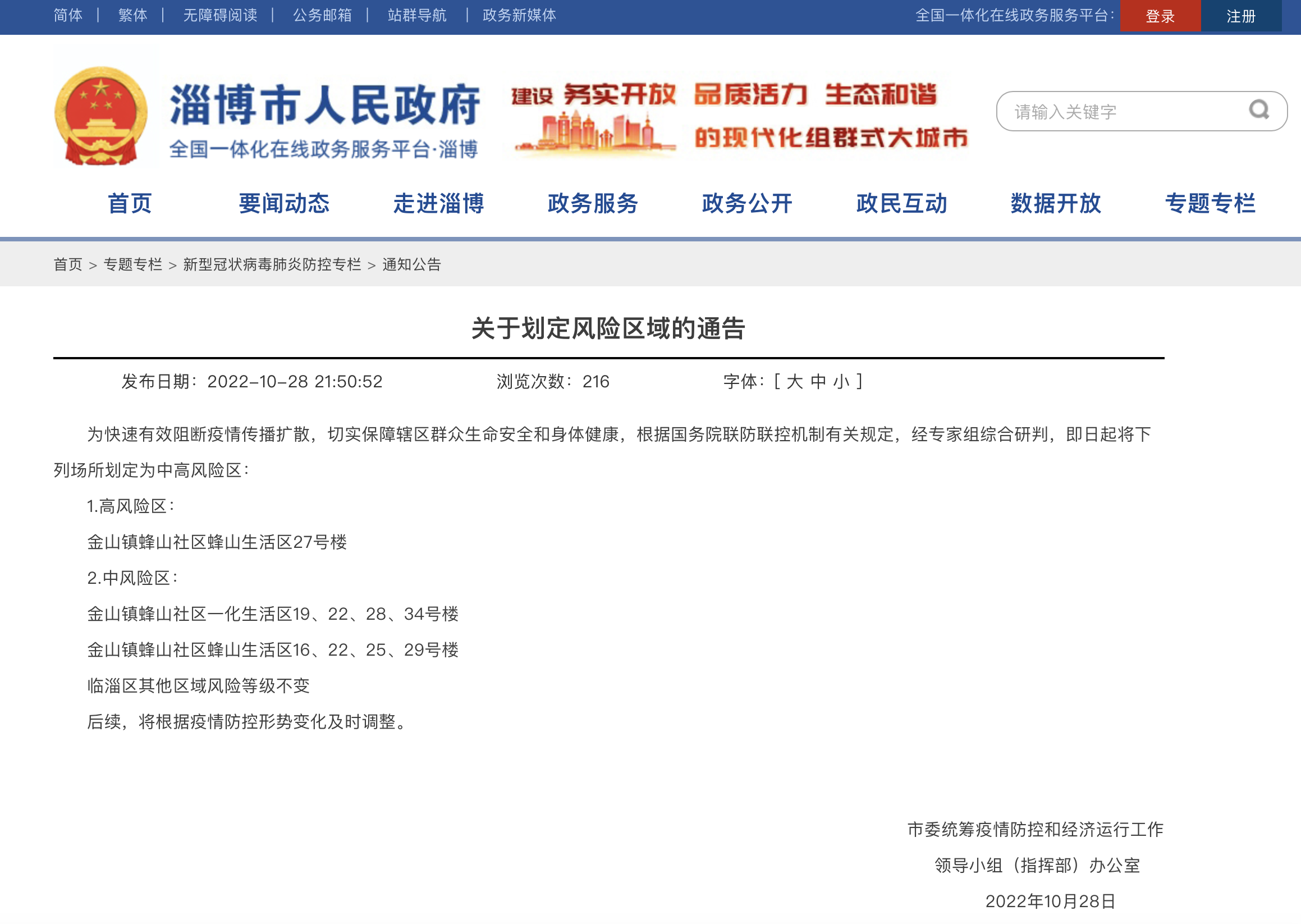 10月28日,山东淄博市划定疫情防控中高风险区——