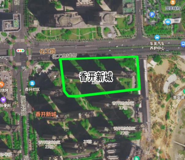 东至茶香路,西至香开社区东侧,南至香开新城中心花园,北至化工路的合围区域(香开新城小区13,15,16号楼)。