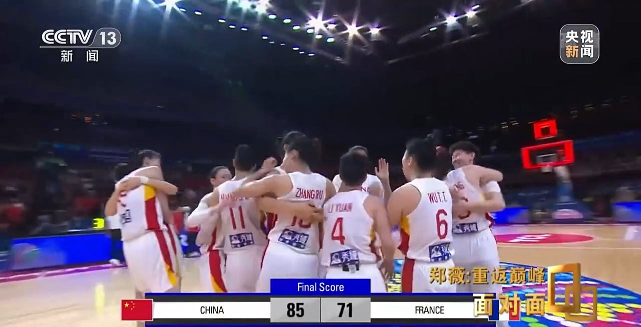 中国队以小组第二的成绩进入八强。四分之一决赛遭遇东京奥运会铜牌得主法国队,中国队敢于与对手硬碰硬。场上身高最矮的李缘一次次冲击篮筐,韩旭在领先优势被缩小到1分时“打三分”成功,最后时刻黄思静还投出一记几乎锁定胜局的三分球,时隔14年,中国队终于再次晋级世界大赛半决赛。