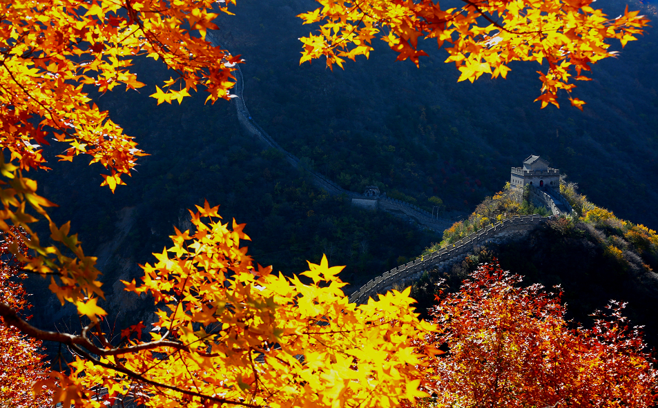 那成片红火的枫叶,在秋阳中点缀着群山,火红得像美艳的云,远处的长城尽显巍峨。