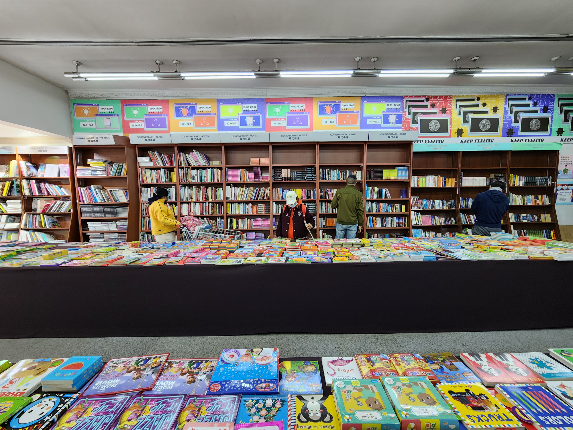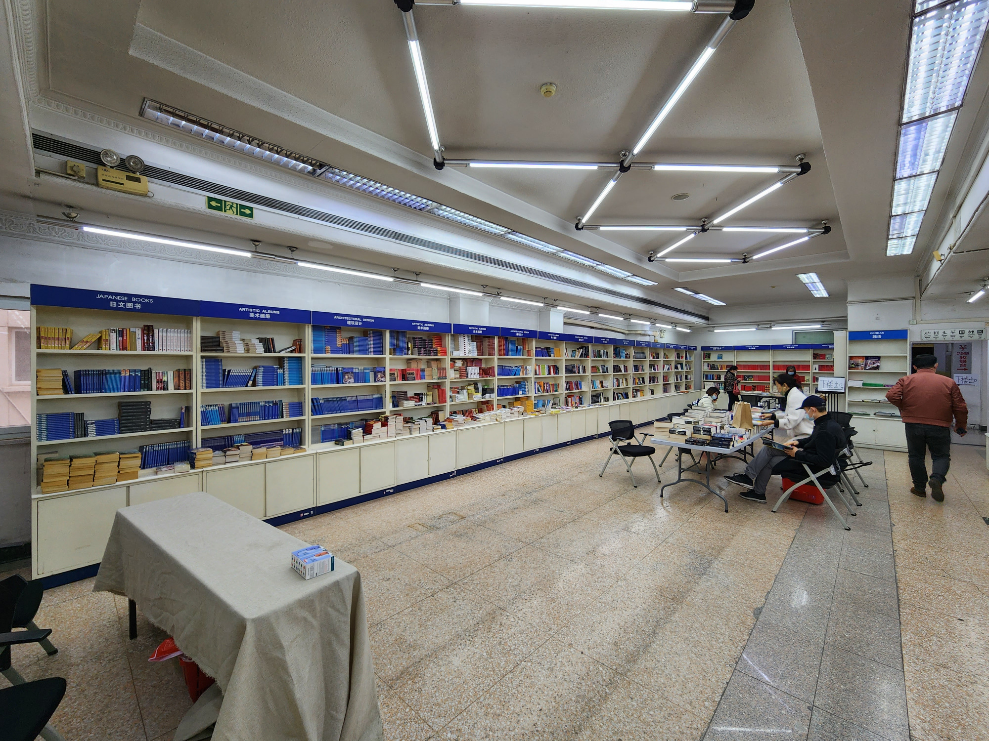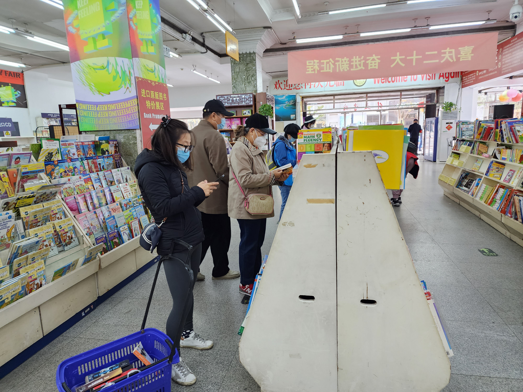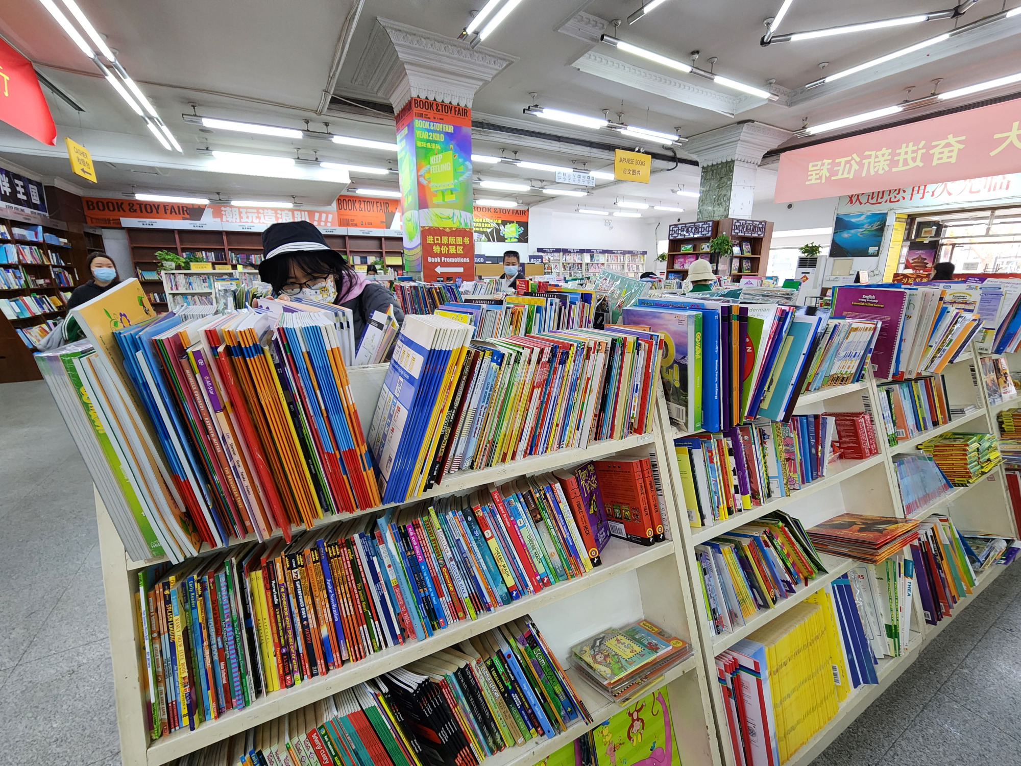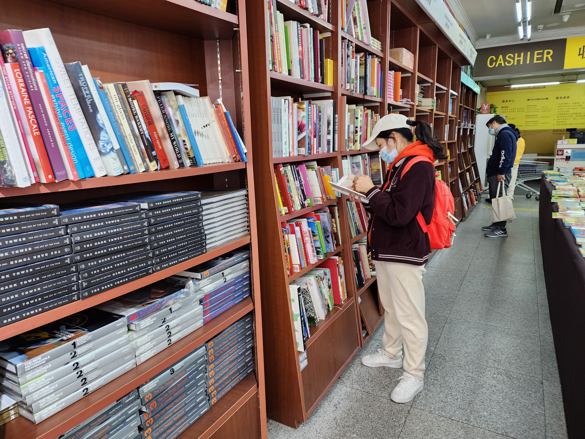 10月31日是北京市外文书店全场4折活动的最后一天,虽然是工作日,还是有不少书迷朋友前来“薅羊毛”。店内,各式各样的外文图书琳琅满目,顾客们有的在认真挑选图书,有的则选择坐在阅读区安静地看书。
