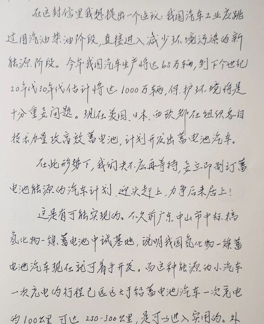 信中说,“在此形势下,我们绝不应再等待,要立即制订蓄电池能源的汽车计划,迎头赶上,力争后来居上。”
