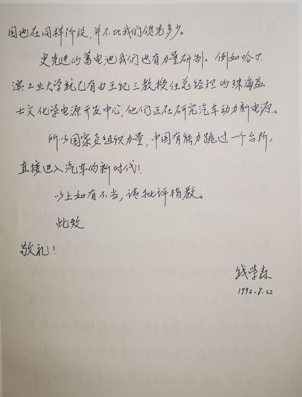 1992年8月22日,钱学森写信,探讨汽车工业。钱学森图书馆供图