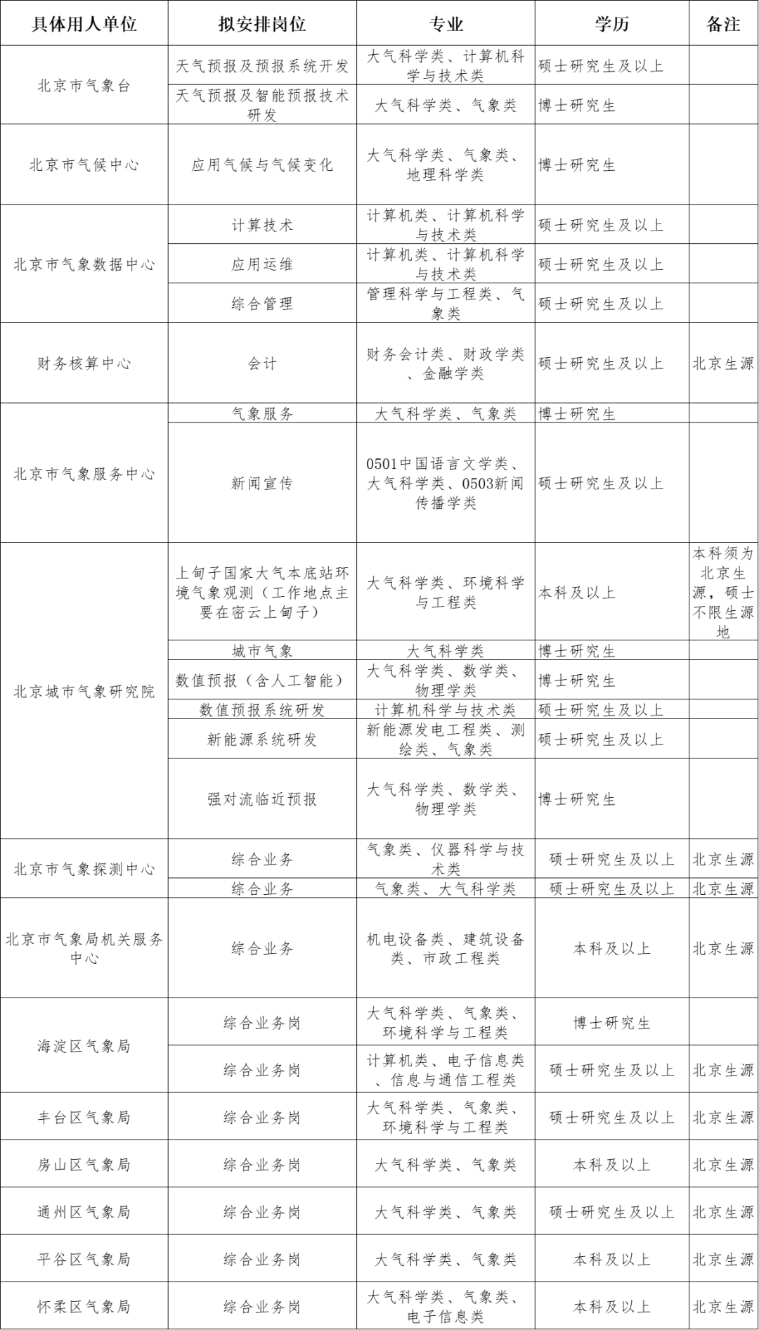 为推进人才强局战略,广泛引进高层次人才,现北京市气象局所属事业单位公开招聘2023年应届毕业生,具体需求见下表: