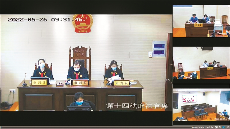 2022年5月26日,董龙庆受贿、挪用公款案一审开庭。图为庭审现场(视频截图)。 (常州市中级人民法院供图)