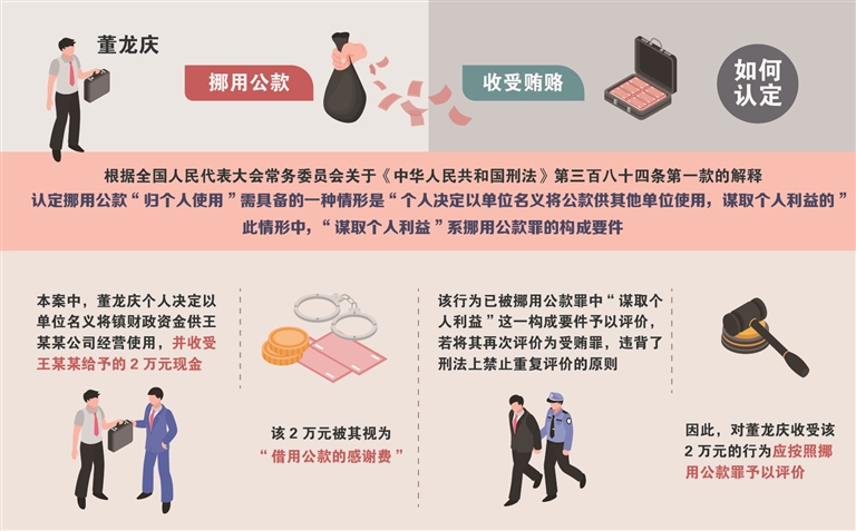 本案中,董龙庆个人决定以单位名义将财政资金供王某某公司经营使用,并收受王某某所送2万元现金,该2万元被其视为“借用公款的感谢费”,该行为已被挪用公款罪中“谋取个人利益”这一构成要件予以评价,若将其再次评价为受贿罪,违背了刑法上禁止重复评价的原则。综上,我们将董龙庆收受该2万元的行为按照挪用公款罪予以评价。
