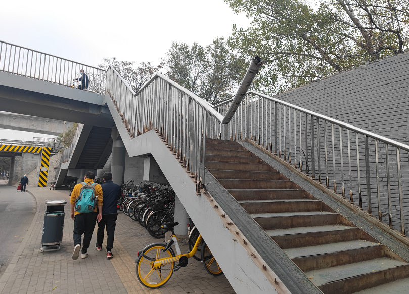 不时有人推着自行车从天桥的缓坡经过。一位路人说,栏杆缺失有一段时间了,现在推着自行车得特别小心,生怕脚下一滑,从旁边跌落,后果不堪设想。