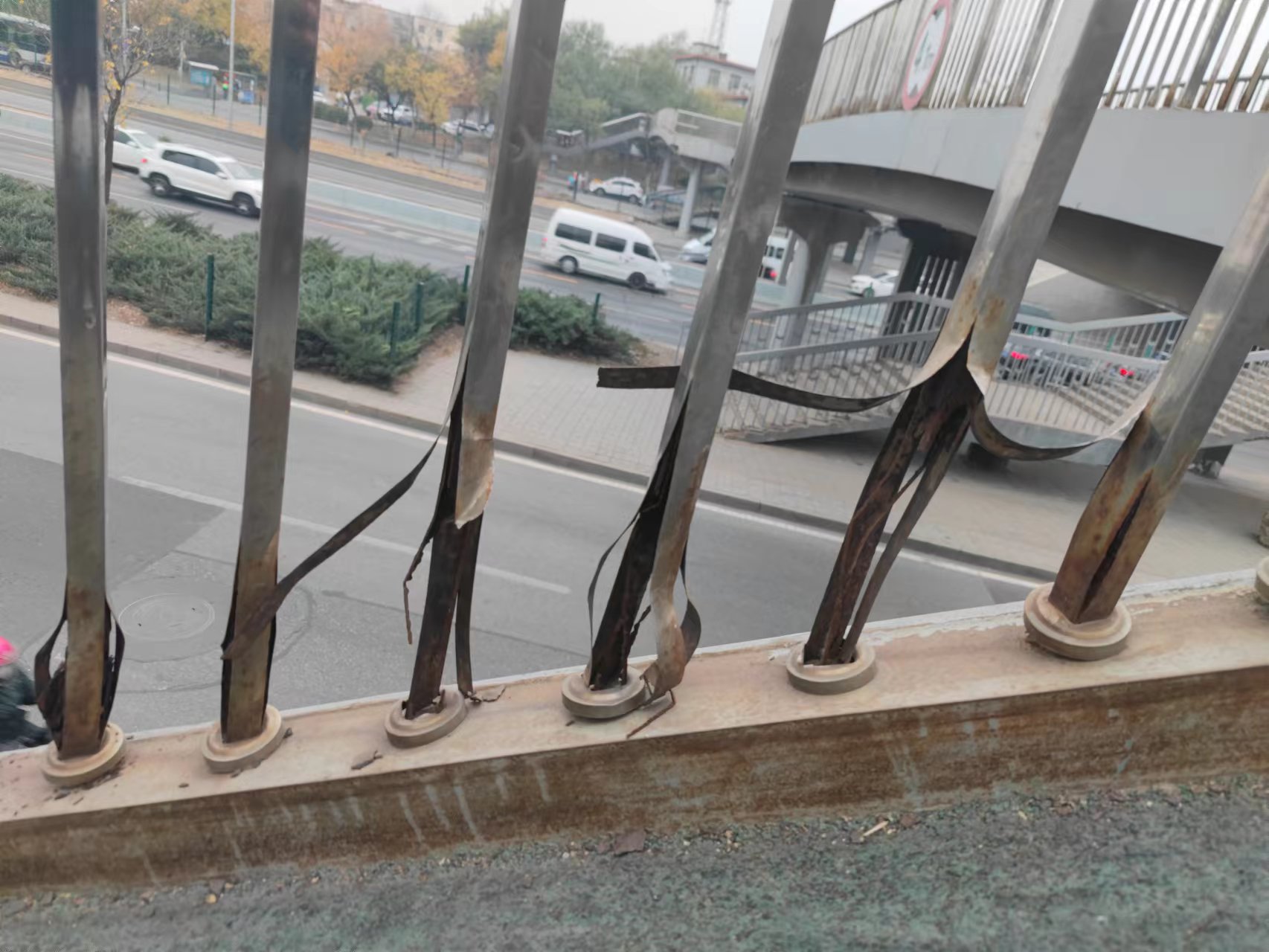 10月30日,记者首先来到位于马路东侧的过街天桥。只见天桥南侧上下坡的一段两三米长的栏杆全都不见了,上方残存的扶手断裂扭曲,成了折线形,翘在空中。