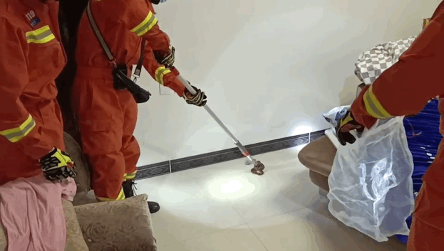 2022年9月,东城消防救援支队北新桥消防救援站到群众报警求助称,家中卫生间里闯进一条大蛇。经过一番寻找,救援人员发现蛇正躲在卫生间马桶后的角落,经观察,此蛇有大概2米左右长度。了解情况后,消防员利用捕蛇器抓住蛇的“七寸”,将它放入事先准备好的编织袋中。