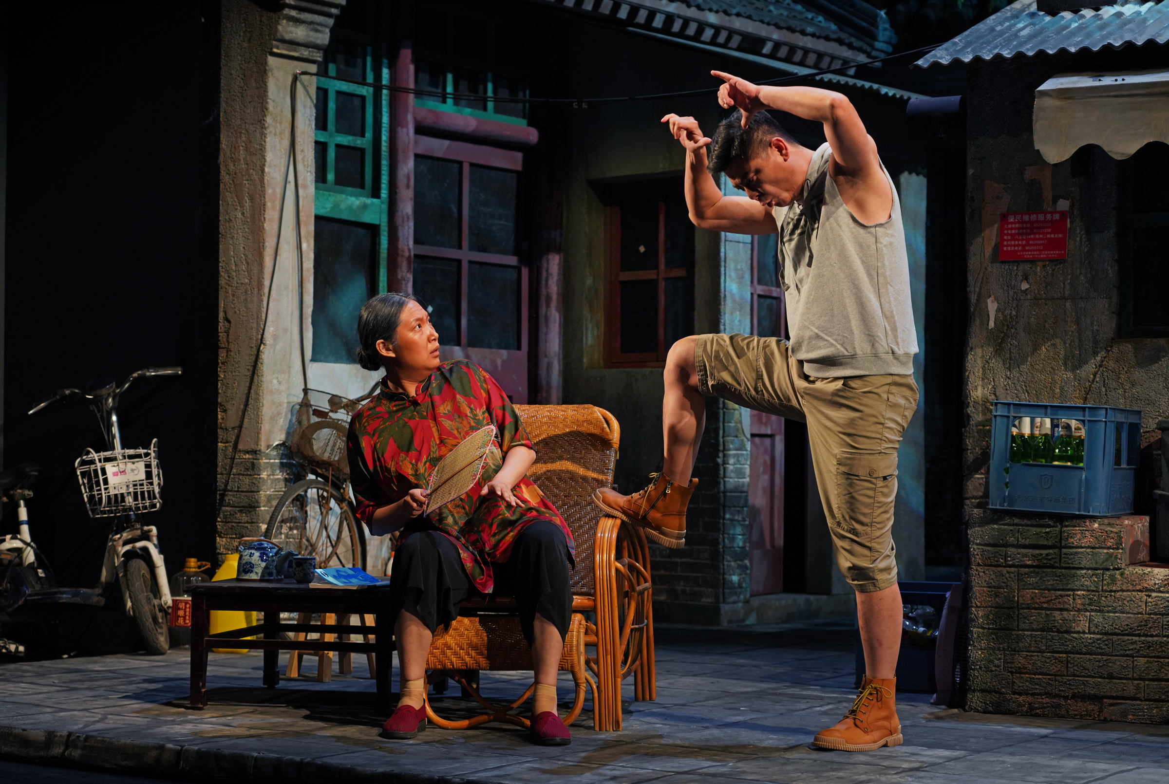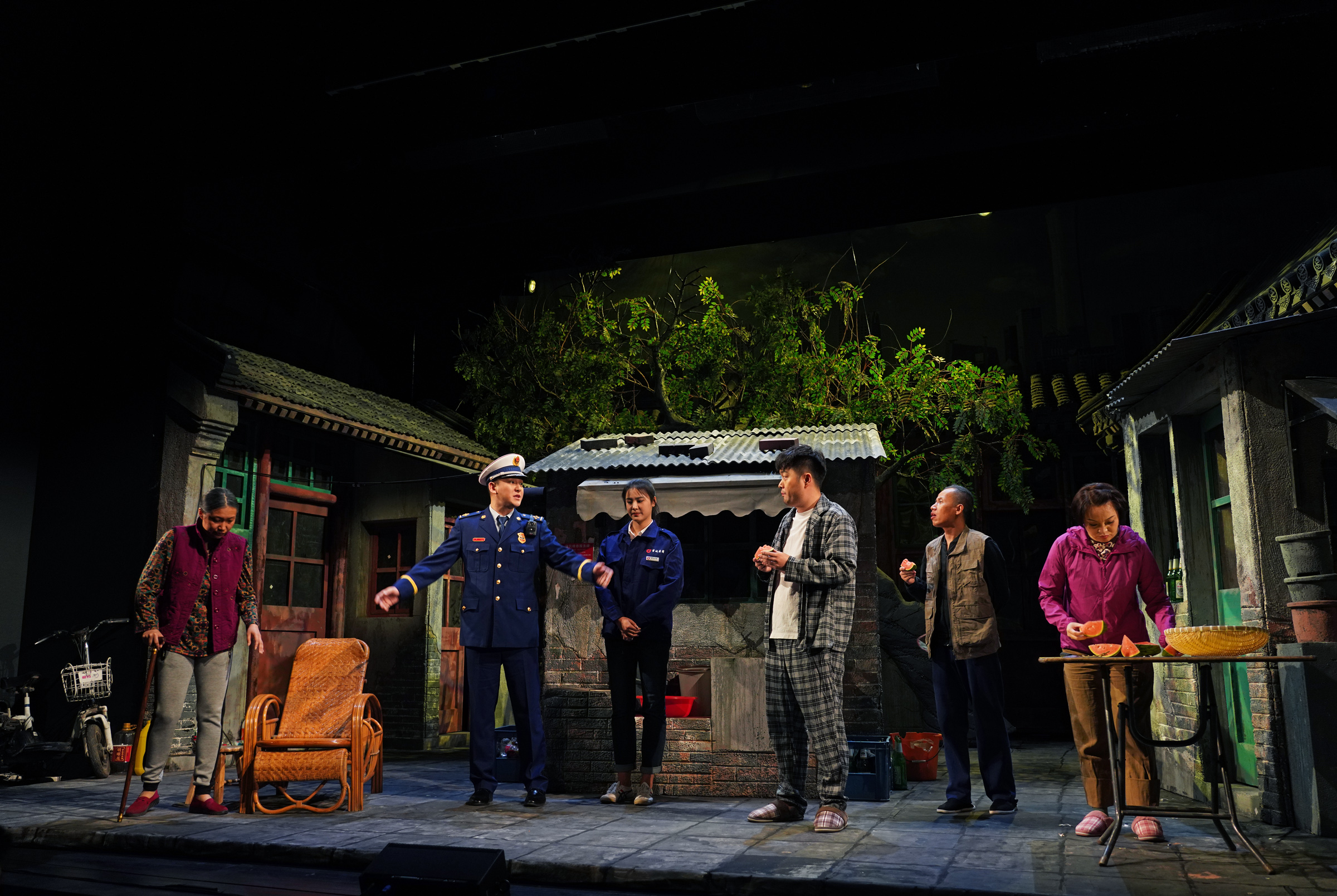 《小院故事》在大华城市表演艺术中心里可容纳人数最多的“歌剧厅”上演,舞台上1:1自然主义设计的胡同小院,让全剧充满普通百姓日常生活气息;台词语言也都是生动的京腔京韵,反映着北京胡同里普通百姓的日常生活。故事发生在京城某胡同公私混合院内,因为私搭乱建、囤积日常垃圾,非法改造旧电池、在院内生明火等种种违规行为,被视为消防安全部门的重点管理对象。小院中,自私泼皮的孙老太太,热衷中医针灸的孙大爷,在邻里间调和斡旋的中年夫妻,看热闹不嫌事大的旗人四姑娘,卖臭豆腐的“坏分子”,坚守传统匠人精神的手艺人,整天扬言要把新能源事业做大的“东城猴”,消防救援支队防火监督员张天齐与京诚集团房管员刘嘉慧构成了一幅活灵活现,有血有肉反映北京胡同生活的众生相。消防员们还全副武装出现在了舞台上,对淹水的胡同进行了疏通,并为小院修补了砖墙。剧中还融入了作为公房管理企业主体——京诚集团的日常管理工作,展示了“皇城根”下北京人富于趣味的日常生活。