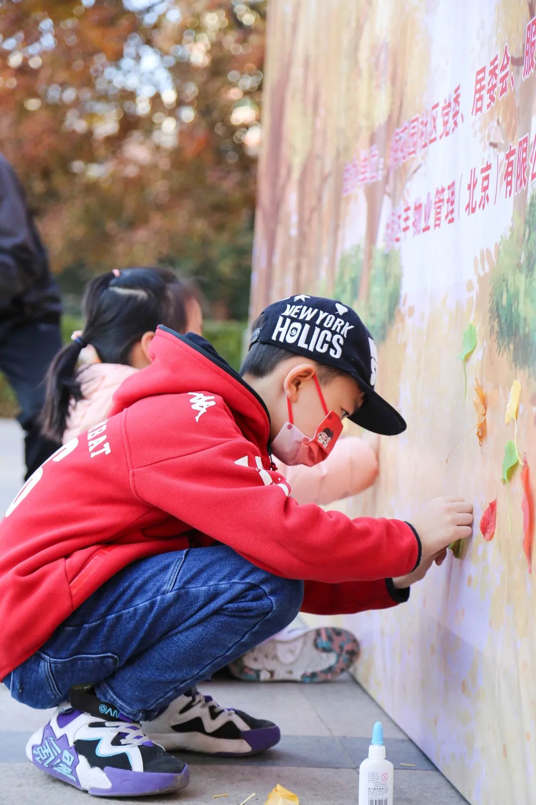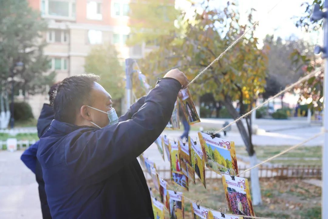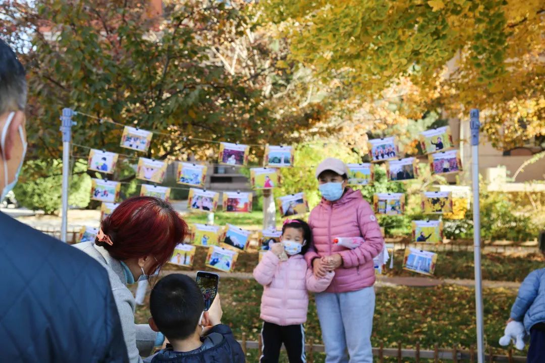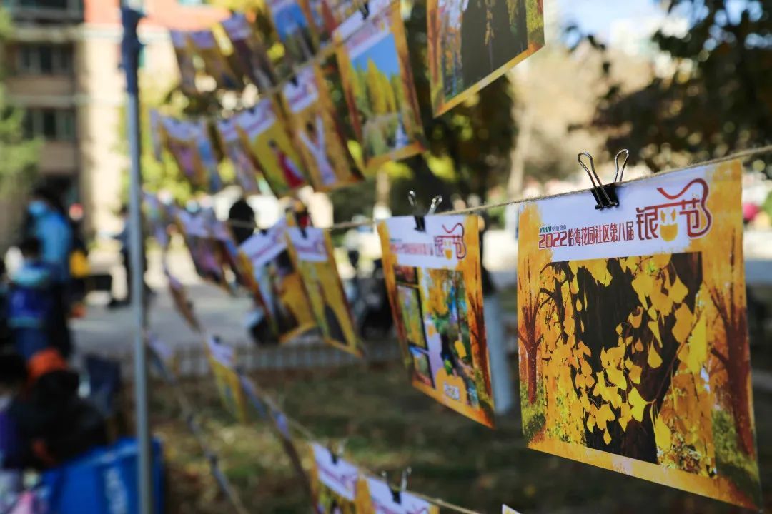 怡海物业工作人员为大家制作专属明信片作为银杏节留念,银杏树前的照片墙上挂满了为社区内大小朋友做好的银杏主题照片。