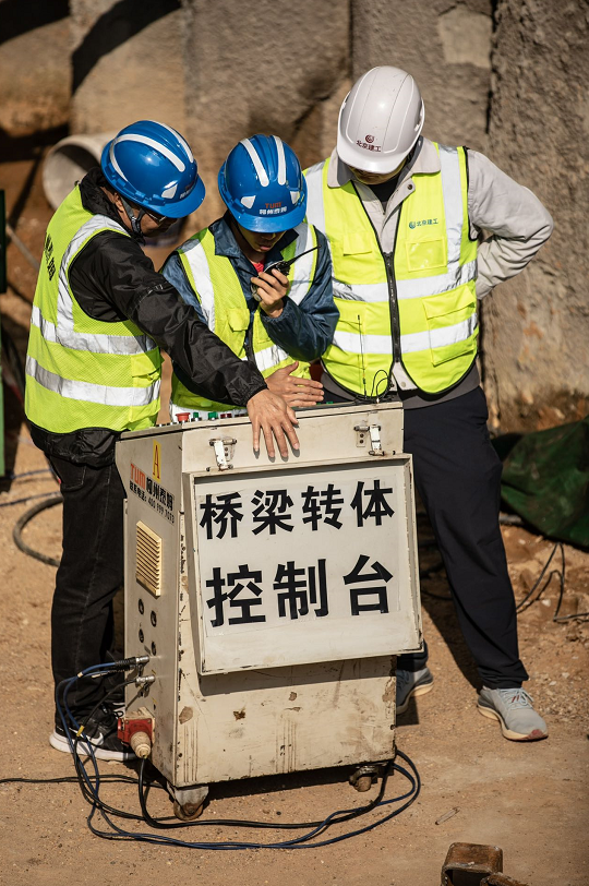 在每个转体桥墩下,项目团队使用一套两台液压同步自动连续牵引系统,通过智能转体主控台发出指令,无线网络双向传输,同时控制连续千斤顶前顶和后顶交替工作,持续不间断牵引转体,全程实时监控转体过程,确保转体施工进度可控、外观精度准确、安全系数达标。