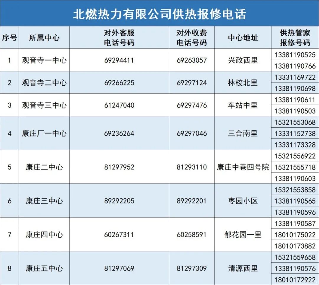 此外,北燃热力公司从9月15号开始陆续对一次管线和二次管线进行分批次打压上水工作,10月18号前已全部完成,10月21号开始全系统的冷态运行调试。试供暖期间,市民家中取暖设备如遇“跑冒滴漏”等现象,可及时拨打北燃热力公司报修电话或供热管家电话。