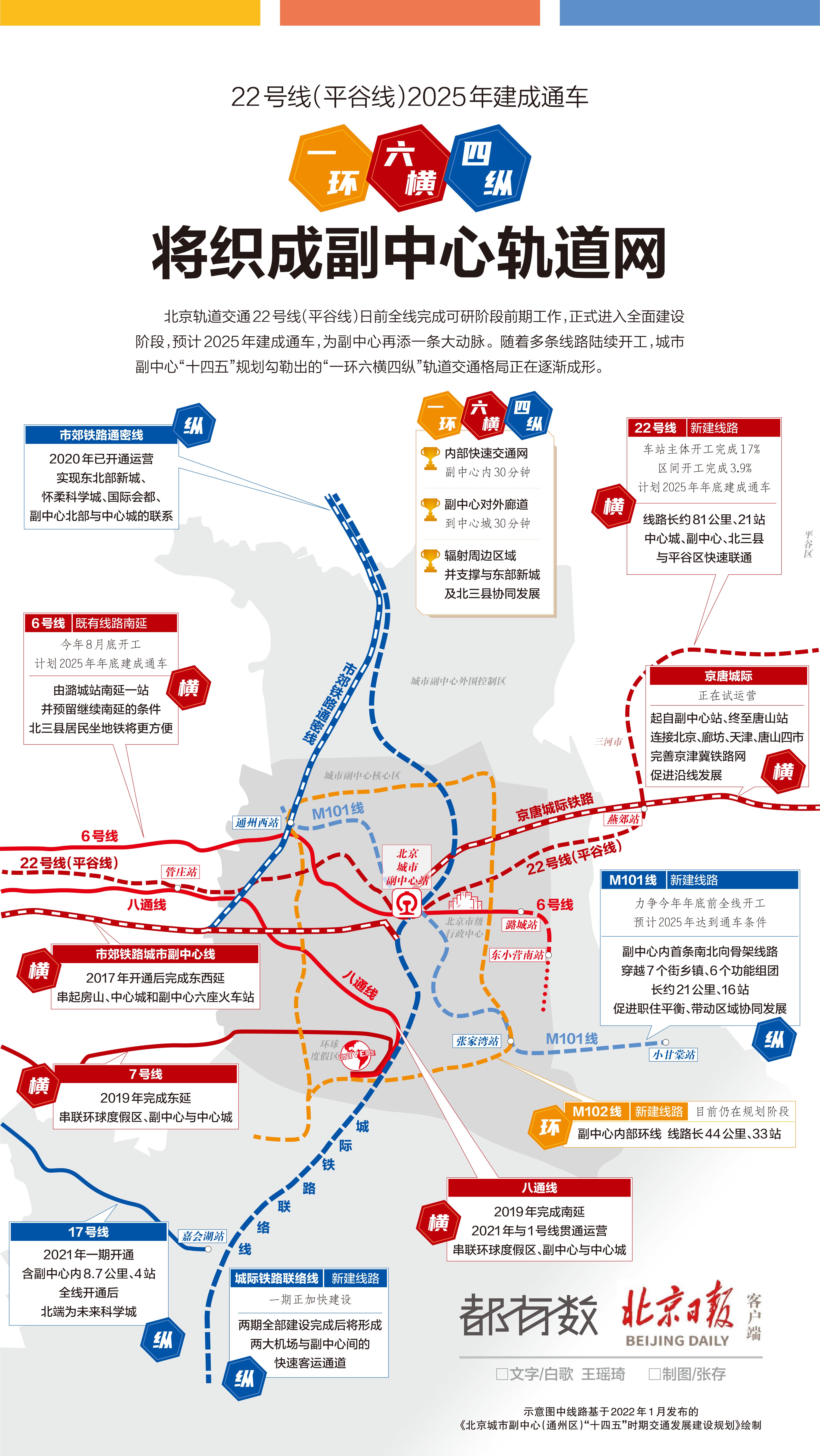 北京轨道交通22号线(平谷线)日前全线完成可研阶段前期工作,正式进入全面建设阶段,预计2025年建成通车,为副中心再添一条大动脉。随着多条线路陆续开工,城市副中心“十四五”规划勾勒出的“一环六横四纵”轨道交通格局正在逐渐成形。