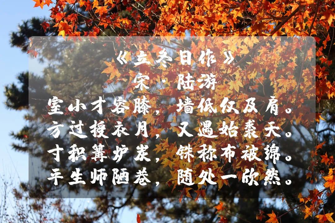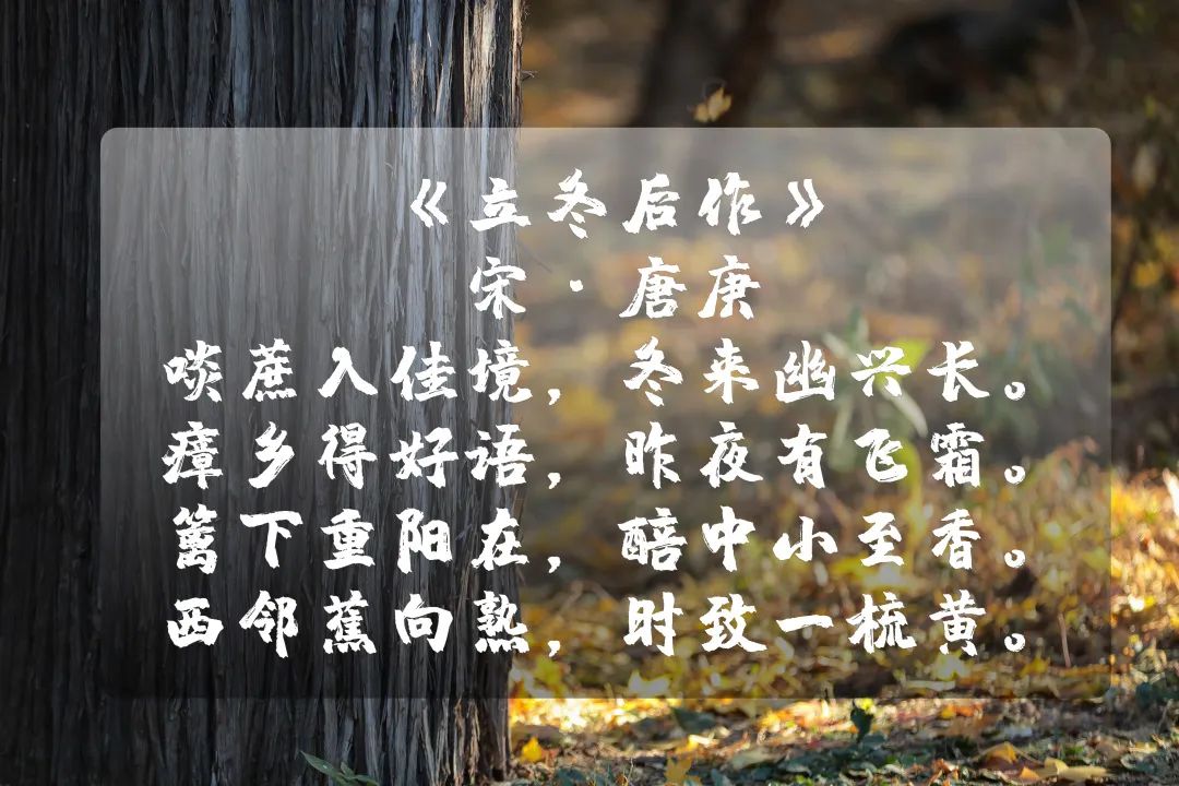 《月令七十二候集解》中写道:“立冬,十月节。立,建始也;冬,终也,万物收藏也。”故立冬是冬季的第一个节气,代表着冬季的开始。万物开始闭蓄,进入休养、收藏状态。