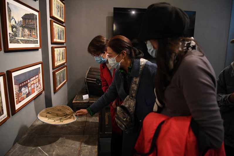 在舞美厅的木质道具箱上,一把旧蒲扇引起了观众们的好奇。“这是模拟音效的道具‘雨扇’,《雷雨》中的雨声就是用它制造出来的。大家可以动手试一试。”在讲解员的鼓励下,不少观众都饶有兴致地体验起来。