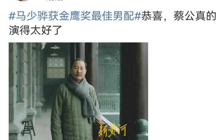 全场最让人泪目的一段是最佳男配角马少骅眼含热泪发表的获奖感言,像他塑造的角色一样感人至深。接过奖杯,他整理好情绪,很认真地感谢了从事表演专业四十年来每一个帮助过自己的人,包括上海戏剧学院的老师,《觉醒年代》的主创人员,表演过程中给自己极大帮助的张黎、管虎、胡玫、吴子牛等导演,以及蔡元培纪念馆和故居的工作人员和专家、北京大学图书馆的老师们,还感谢了长年累月给予自己无限关爱的家人们。最后他说,“我给自己定了一个位,我是百姓中的演员,演员中的百姓,我将继续努力塑造出更多更好的角色奉献给观众,我将用我一生的努力去做到,做一个人民喜爱的好演员,为此我再出发。”