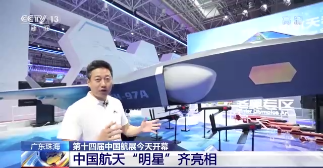 总台央视记者 李宁:在航天馆里还有一件关注度非常高的产品,就是我身边的这架飞鸿无人机,在去年的时候飞鸿无人机是首次亮相,今年推出了飞鸿97A,这是一款空对空的无人机,我们可以看一下它的弹仓,一共有8枚弹,它可以携带巡飞弹或者是空对空格斗弹。此外,在构型上有了非常大的变化,它的进气口由背部挪到了机身的侧面,同时由单发变成了双发,这样极大地增加了它在空中格斗时候的机动性。