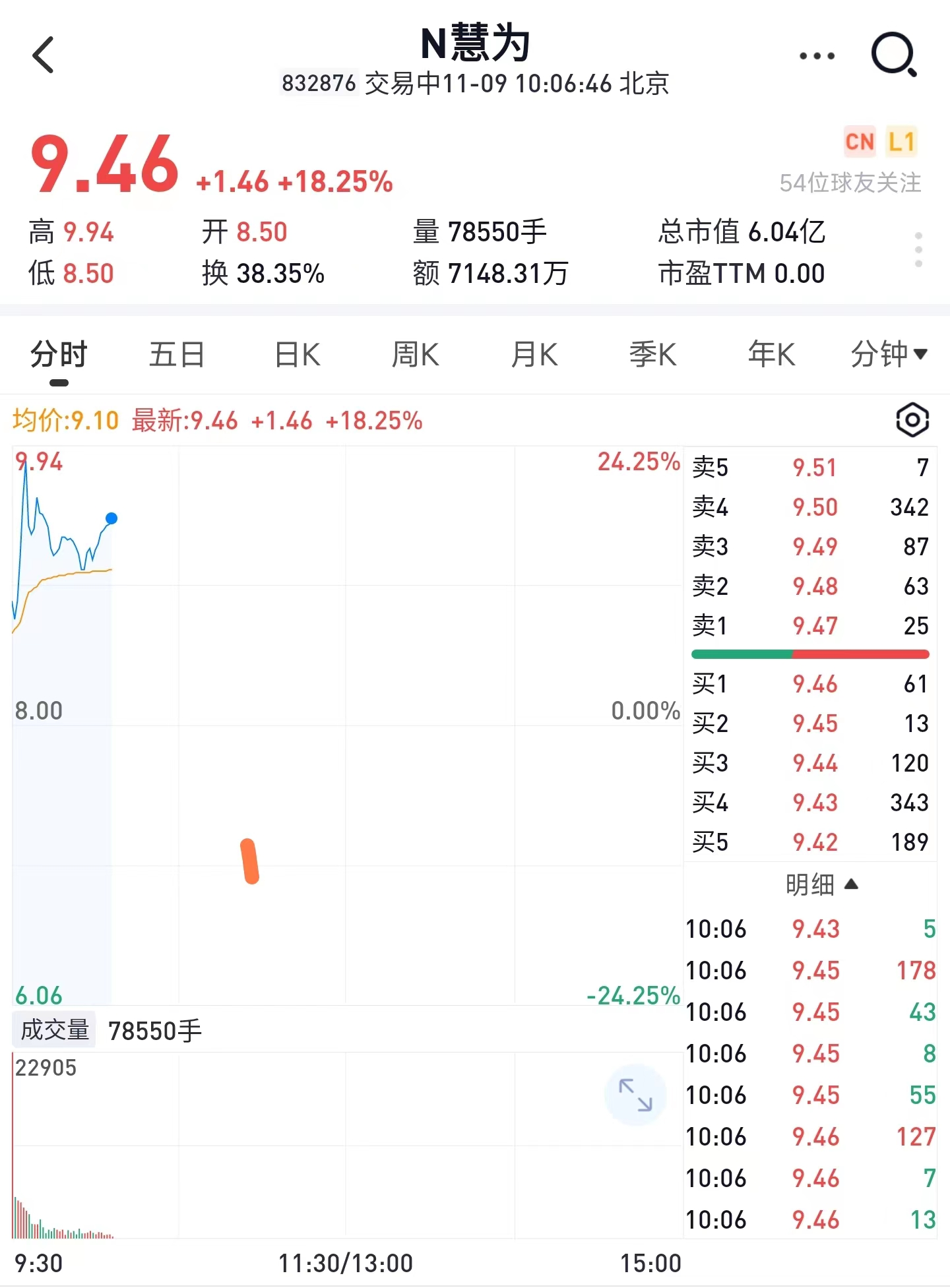 上市首日,慧为智能以每股8.5元开盘,相较发行价上涨6.25%。截至发稿,盘中最高涨至9.94元,涨幅超24%。