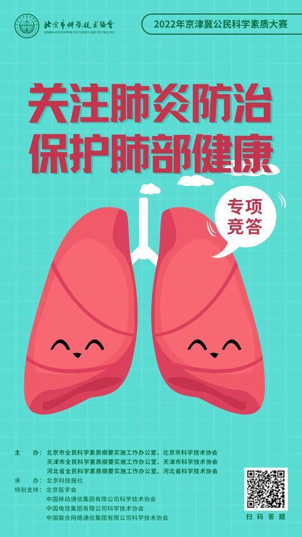 肺炎最早出现的症状有哪些?防治哮喘最有效的方法是什么?肺心病患者可以进行的体育锻炼是什么……11月12日是第十四个世界肺炎日。2022年京津冀公民科学素质大赛推出“关注肺炎防治 保护肺部健康”专项竞答。