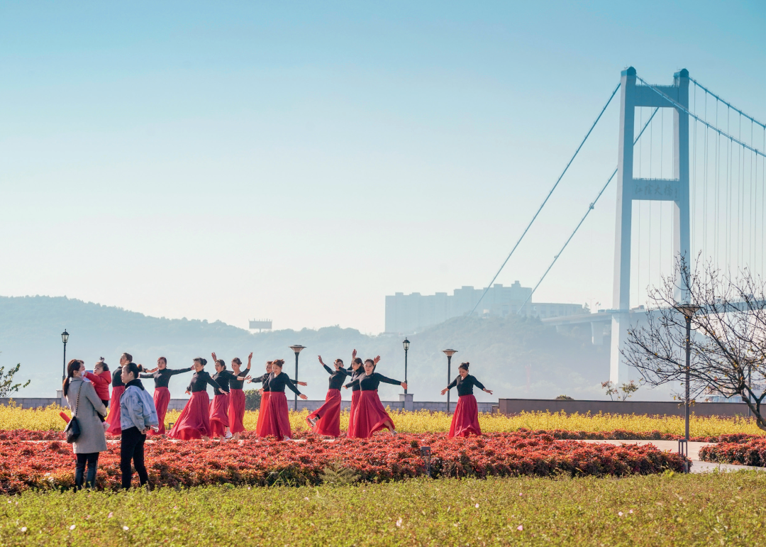 市民在位于江阴长江大桥北岸的音乐花海公园排练广场舞(2021年11月12日摄) 杨磊摄