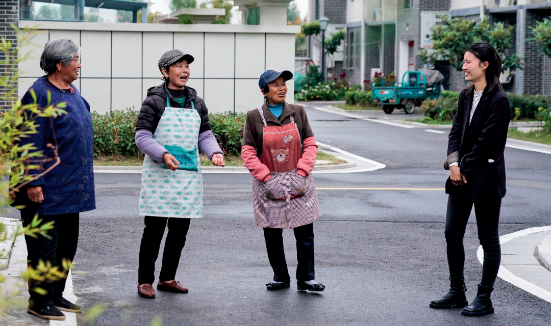 江苏省泗洪县临淮镇胜利社区党总支书记刘元梦(右一)在小区内和居民拉家常(2022 年 10 月 26 日摄)。洪泽湖畔的江苏省泗洪县临淮镇胜利社区,是渔民集中搬迁上岸后形成的新型农村社区